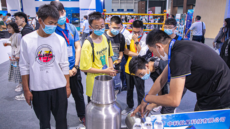 在中挪未來(lái)創(chuàng)新科技(青島)有限公司展區(qū),參觀者們正在通過(guò)視頻了解船體除銹機(jī)器人的工作過(guò)程?!八茏詣?dòng)吸附在船體上,把生銹的大船清理的干干凈凈?!币晃恍∨笥迅嬖V記者。