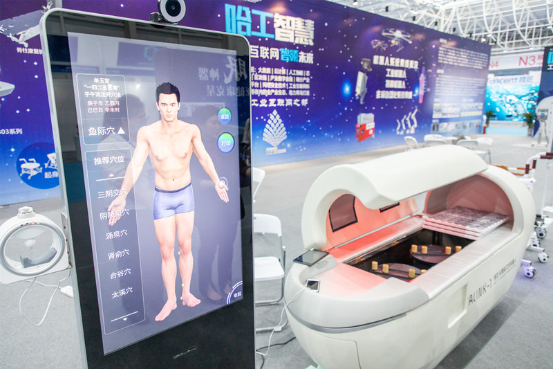 位于海工裝備與海洋科技展區(qū)內(nèi)的哈工大機(jī)器人集團(tuán)展位里,人氣頗旺。哈工(青島)機(jī)器人有限公司哈工智慧市場(chǎng)總監(jiān)劉瑛正一邊演示一邊為大家介紹哈工大最新研發(fā)的機(jī)器人?!拔覀冏灾餮邪l(fā)了這套中醫(yī)問(wèn)診系統(tǒng),這款艾灸機(jī)器人能夠依托傳感技術(shù)進(jìn)行脈診,并通過(guò)圖像分析進(jìn)行面診、舌診,搭配體質(zhì)辯診問(wèn)題庫(kù),生成報(bào)告后傳輸?shù)皆贫诉M(jìn)行數(shù)據(jù)分析,會(huì)生成艾灸診療方案,機(jī)器人會(huì)根據(jù)方案通過(guò)點(diǎn)對(duì)點(diǎn)穴位為人體進(jìn)行調(diào)理?!?