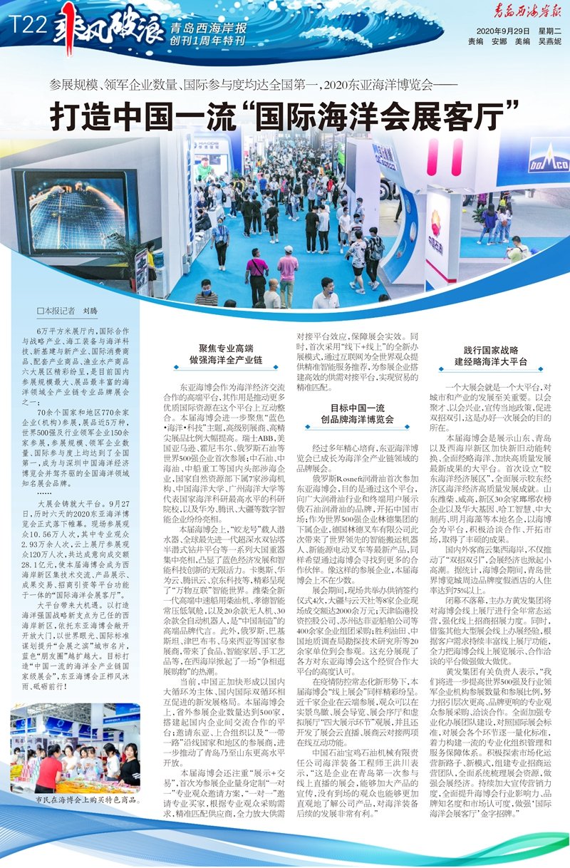 大展會(huì)鑄就大平臺(tái)。9月27日,歷時(shí)六天的2020東亞海洋博覽會(huì)正式落下帷幕。現(xiàn)場參展觀眾10.56萬人次,其中專業(yè)觀眾2.93萬余人次,云上展廳參展觀眾120萬人次,共達(dá)成意向成交額28.1億元,使本屆海博會(huì)成為西海岸新區(qū)集技術(shù)交流、產(chǎn)品展示、成果交易、招商引資等平臺(tái)功能于一體的“國際海洋會(huì)展客廳”。