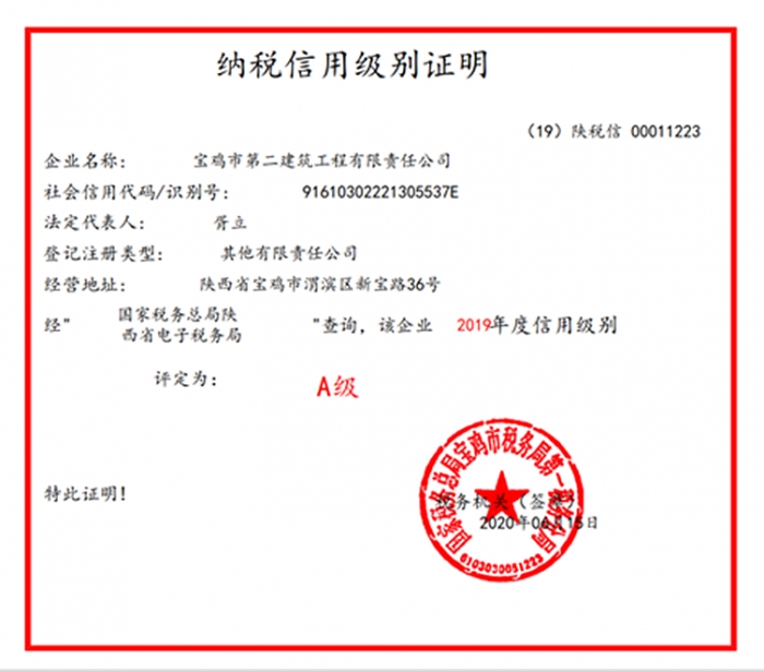 近日,從陜西省稅務(wù)局傳來(lái)喜訊,公司榮獲陜西省2019年度“納稅信用A級(jí)納稅人”榮譽(yù)稱(chēng)號(hào)。