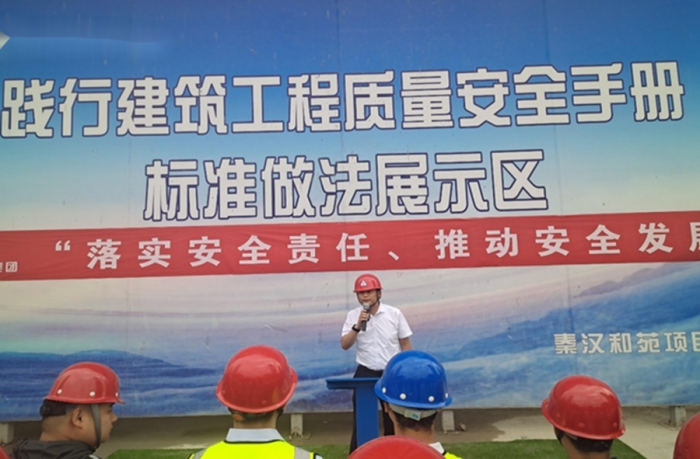 秦漢和苑項目經(jīng)理申宏亮對項目安全管理作了經(jīng)驗交流并對安全生產(chǎn)做出了鄭重承諾。他提到,現(xiàn)場安全生產(chǎn)不光要明確目標、突出重點,更要樹立大局意識,認清形勢、狠抓落實。只有把安全生產(chǎn)工作做細做好、落到實處,才能創(chuàng)造一個安全、有序、和諧的生產(chǎn)環(huán)境。