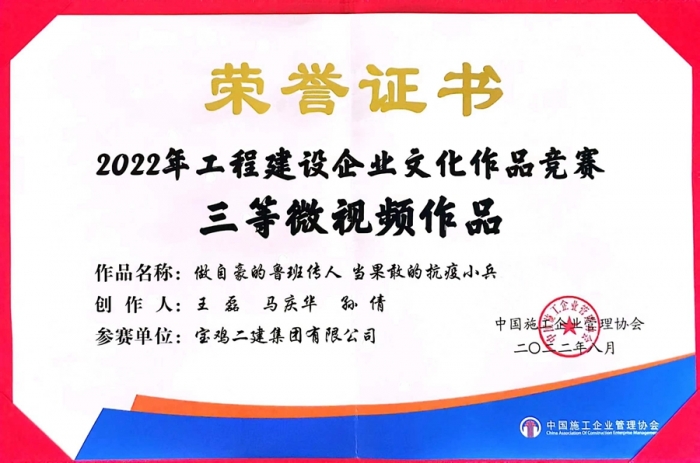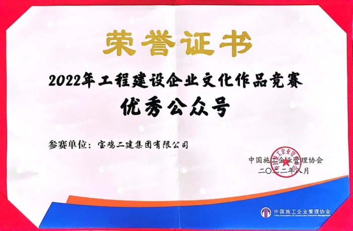 在喜迎二十大之際,中國施工企業(yè)管理協(xié)會在南寧隆重召開2022年度工程建設企業(yè)文化成果交流會,會議公布了2022年度工程建設企業(yè)文化作品競賽評選結(jié)果,并進行表彰。寶雞二建公眾號被評為“全國工程建設行業(yè)優(yōu)秀公眾號”,企業(yè)文化作品《做自豪的魯班傳人 當果敢的抗疫小兵》微視頻榮獲三等獎。
